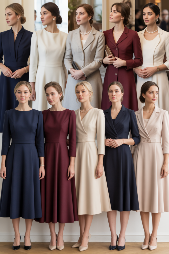 - Fabrics: Choose lined, non-sheer textiles with gentle drape—crepe, ponte, voile with lining, and wool blends.