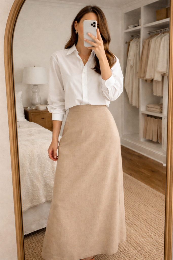 This is minimalism with modesty. A longline button-up shirt paired with a column midi skirt looks clean, architectural, and incredibly chic. It’s comfortable and breathable while still structured enough for a day out—or a night in with friends and a charcuterie board.