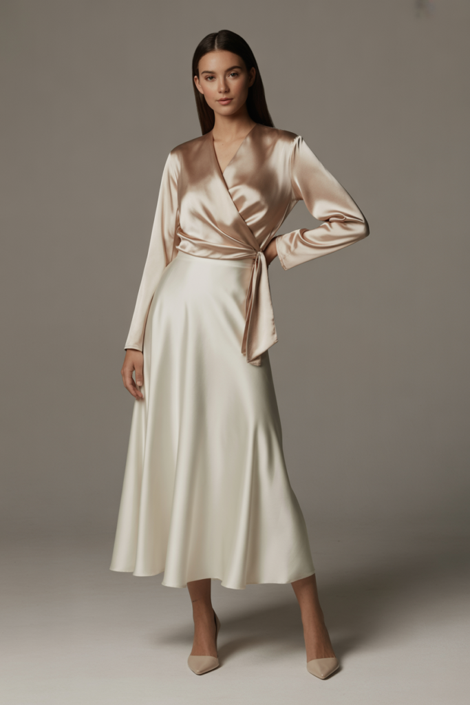 Wrap tops can be incredibly modest when they’re done right. Choose a satin-soft wrap blouse with a secured snap or inner tie, and you get a graceful neckline, long sleeves, and a flattering drape—no fussing, no slipping. It’s the piece that transforms simple bottoms into something special.