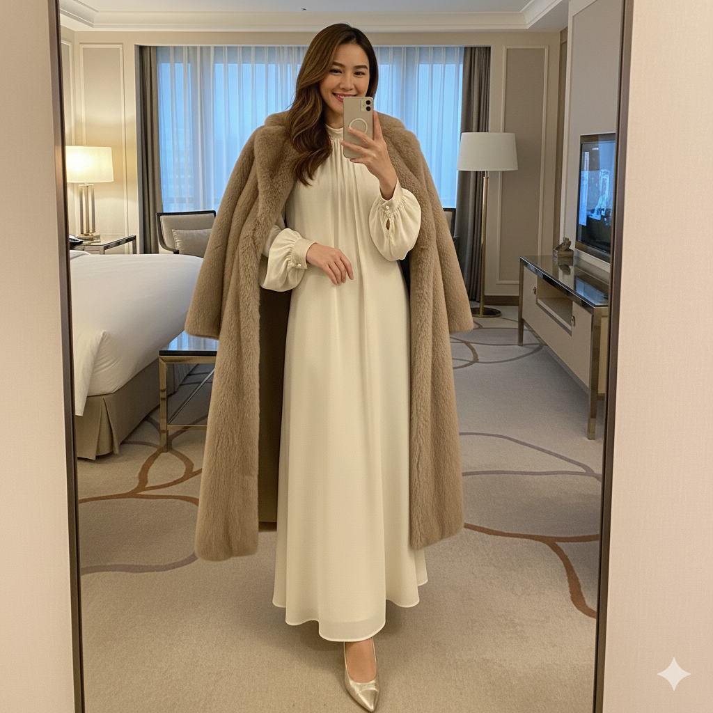 - Extras: discreet slip if your dress clings, and a scarf that complements rather than competes.