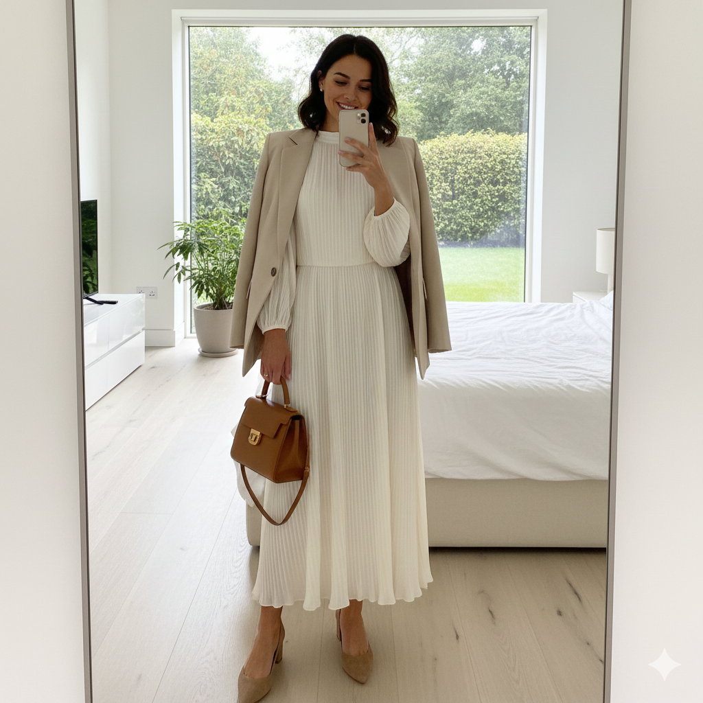 - Pleated midi dress in a soft shade (think sage, blush, or classic navy)