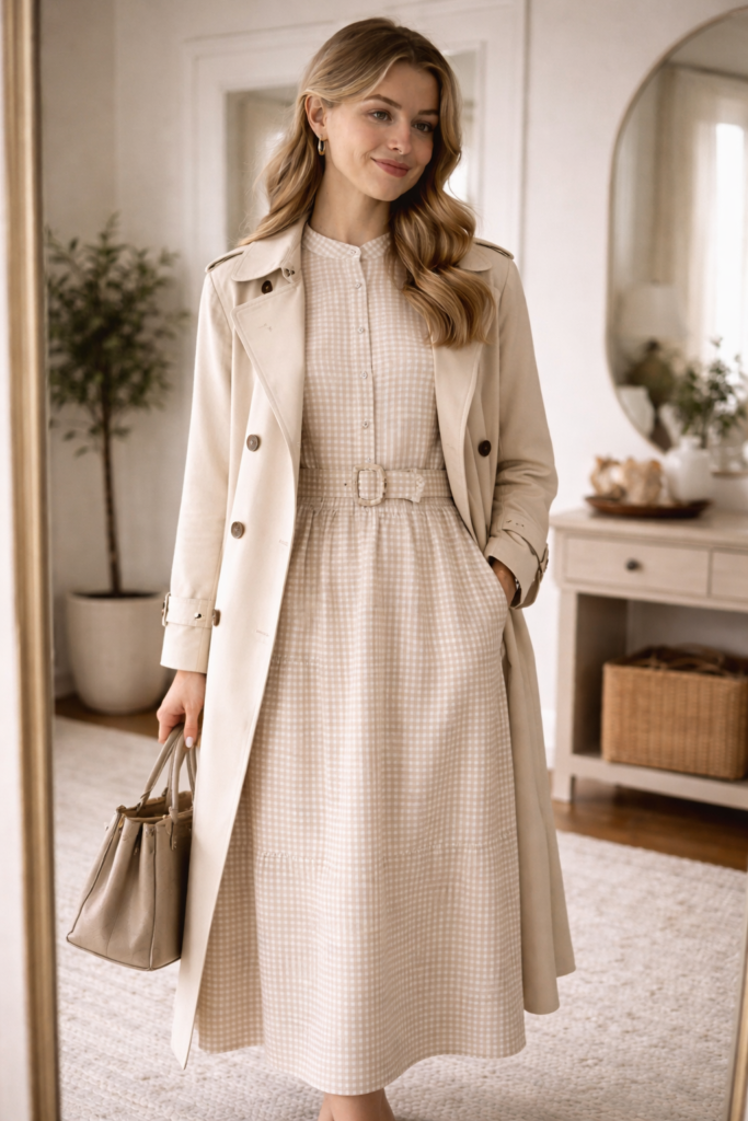 Want to look like you planned ahead—even if you didn’t? A soft checkered dress with a gentle A-line skirt and a light trench reads refined without trying hard. This combo whispers elegance and works across seasons.