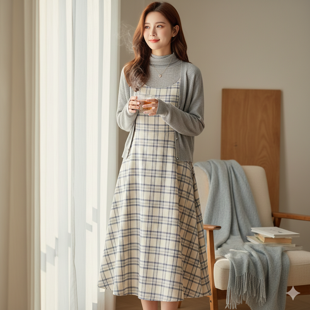 3. Cardigan-Layered Check Dress That’s Cozy, Cute, And Zero-Fuss
