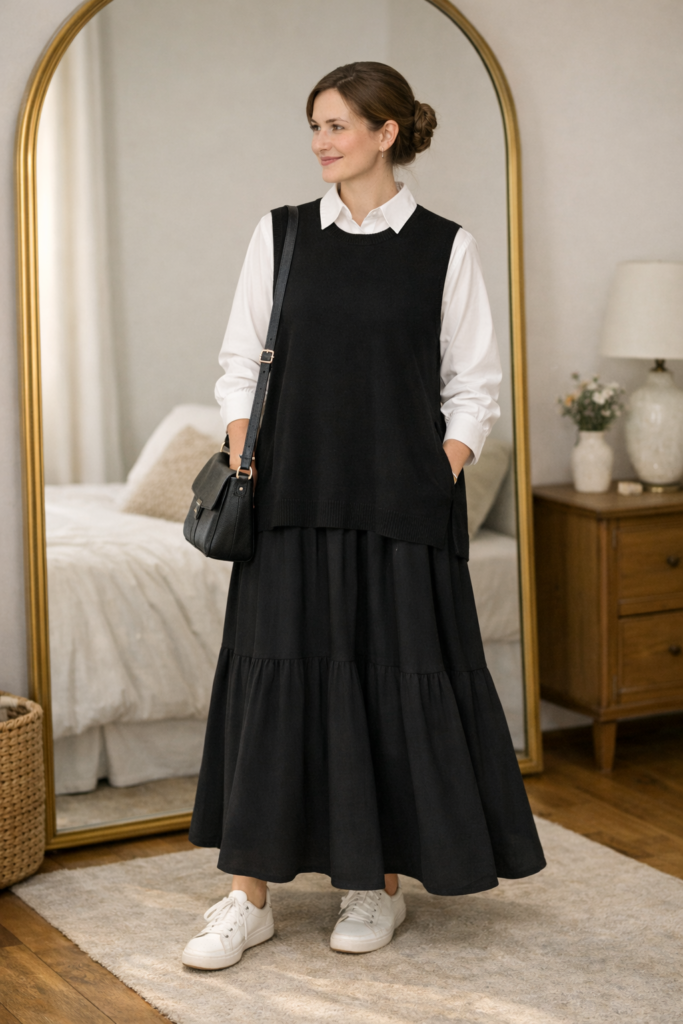 Yes, you can wear a hoodie to church-adjacent plans—and look refined. Pair a soft, oversized hoodie with a flowy midi skirt and you get comfort with elegant movement. It’s sporty, feminine, and completely modest without feeling fussy.