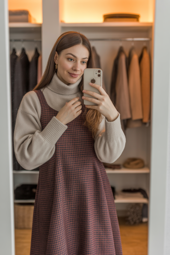 When temperatures drop, this combo is a lifesaver. Layering a fine-knit turtleneck under a plaid dress feels cozy and modest without bulk. It’s the “comfy but polished” look you’ll wear from morning errands straight to small group—seriously, it just works.